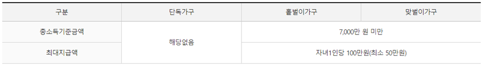 - 자녀장려금: 저소득 가구의 자녀양육을 지원하기 위해 총소득(부부합산) 7,000만원 미만이면서 부양자녀(18세 미만)가 있는 경우 1인당 최대 100만원(최소50만 원)을 지급하는 제도로 총소득 기준을 제외한 나머지 수급요건은 근로장려금과 동일합니다.