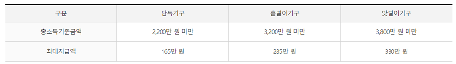 - 근로장려금: 일은 하지만 소득이 적어 생활이 어려운 근로자, 사업자(전문직 제외)가구에 대하여 가구원 구성과 근로소득, 사업소득 또는 종교인소득에 따라 산정된 근로장려금을 지급함으로써 근로를 장려하고 실질소득을 지원하는 근로연계형 소득지원 제도입니다. 근로장려금은 가구원 구성에 따라 정한 부부합산 총급여액 등을 기준으로 지급액을 산정합니다.